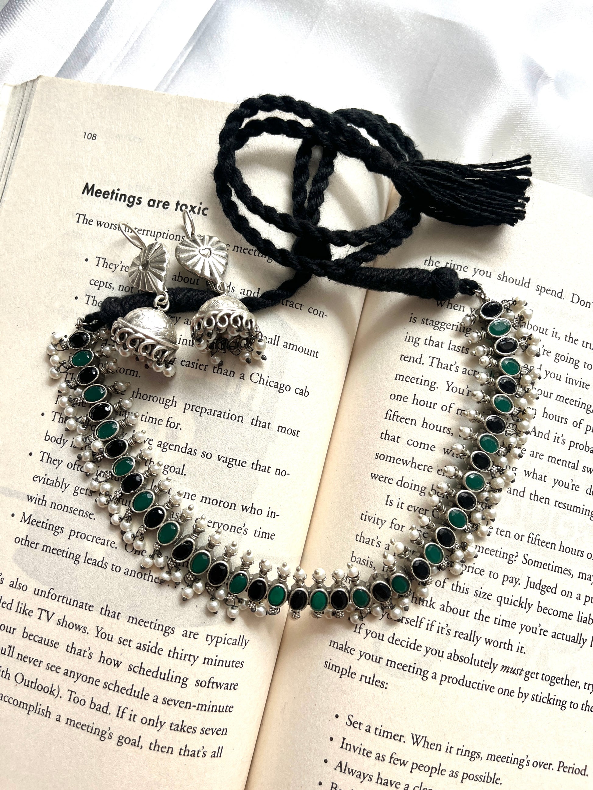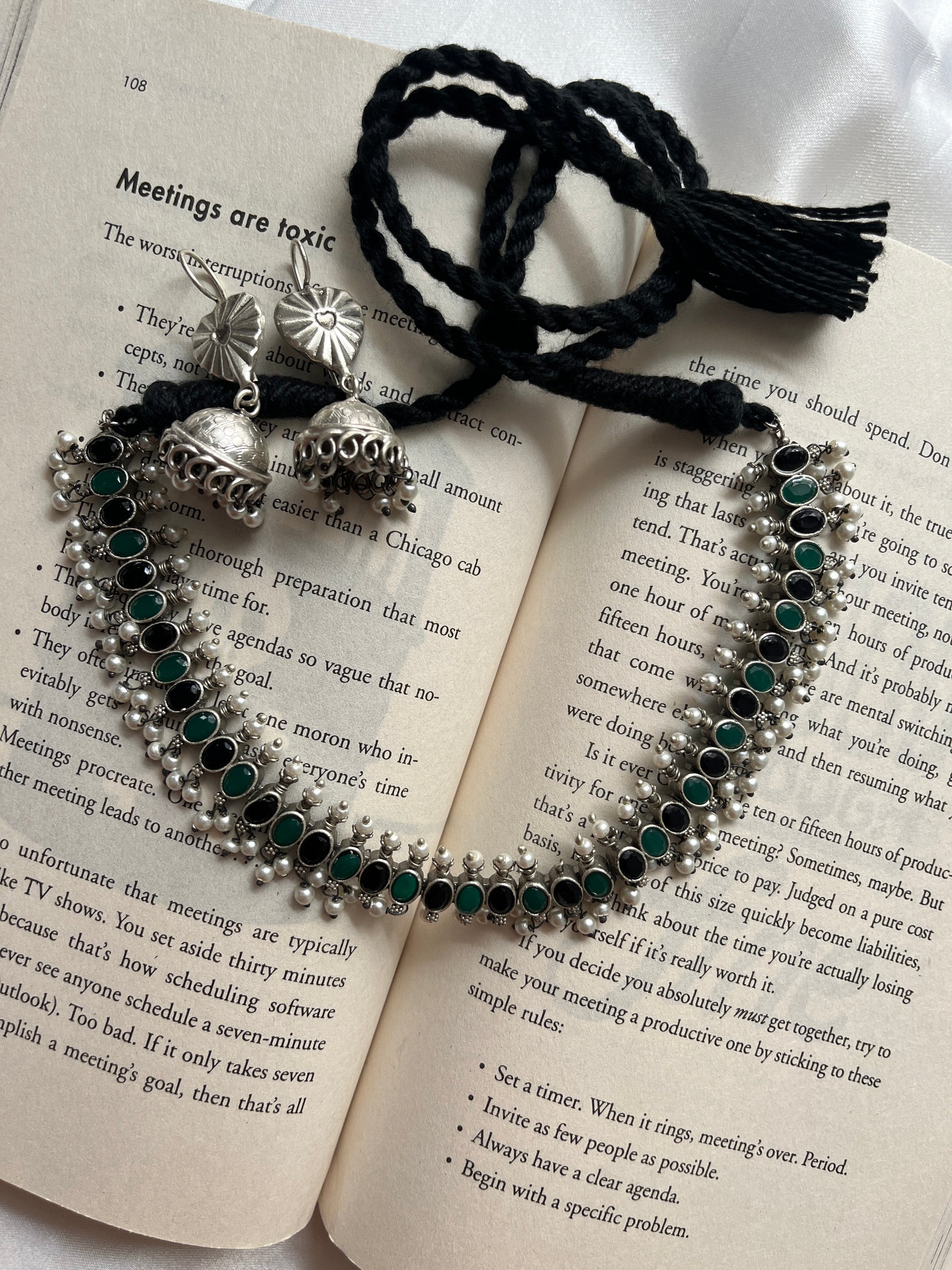Mrinali Oxidised Black & Green Stone Necklace Set