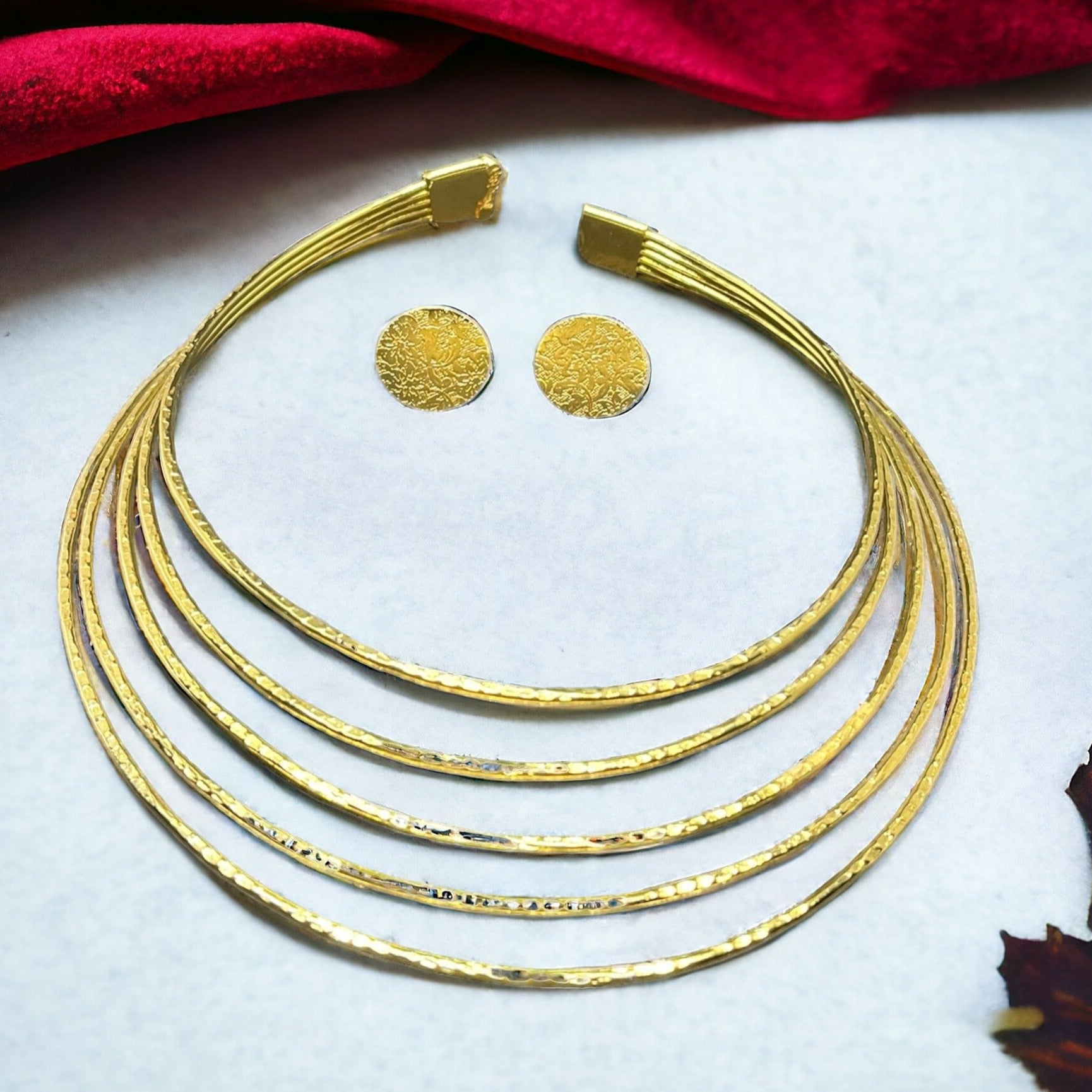 Elevate your ensemble with this striking five layer hasli choker, paired perfectly with coordinating earrings, exuding a blend of regal charm and contemporary allure.