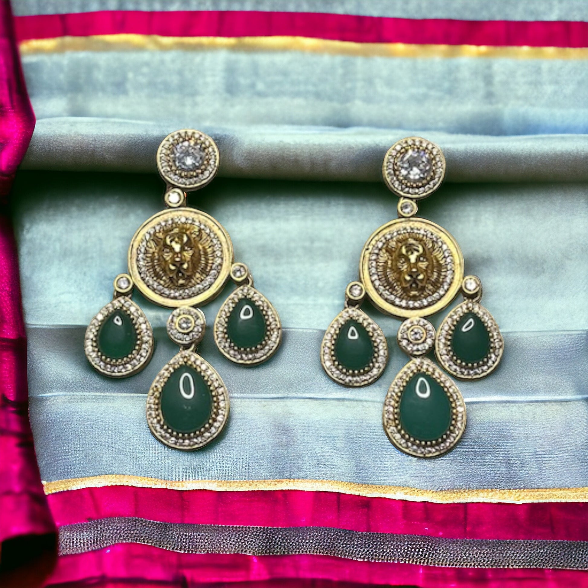Dive into the realm of opulence with our SS Regal Roar Earrings, a manifestation of regal allure and majestic finesse. Crafted with meticulous attention to detail, these earrings feature a commanding lion motif atop, symbolizing strength and sovereignty. Below, three resplendent tear-shaped stones gracefully cascade, exuding an aura of timeless elegance. Adorn yourself with these exquisite earrings and unleash your inner royalty, as each sway and sparkle echoes the resounding roar of regality.