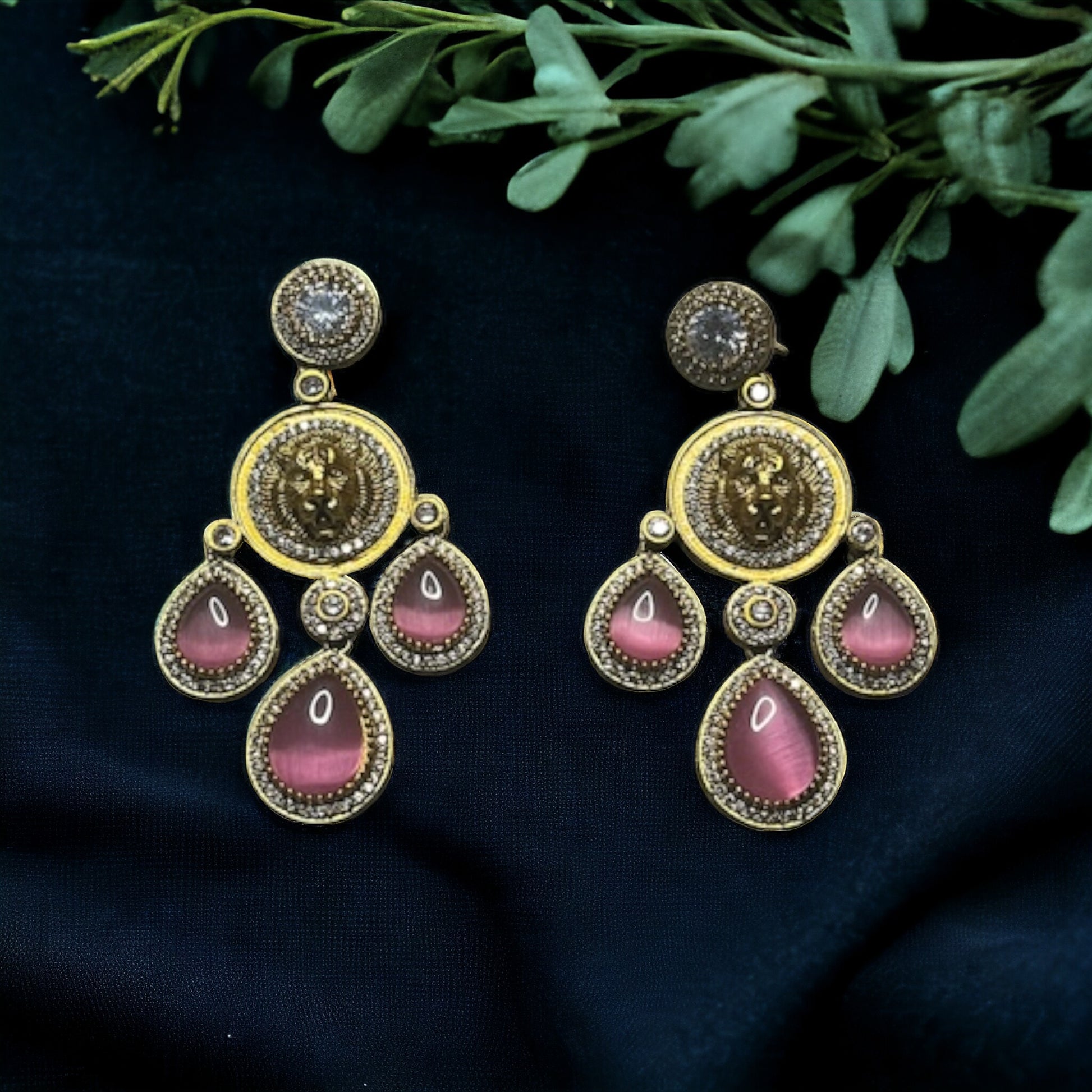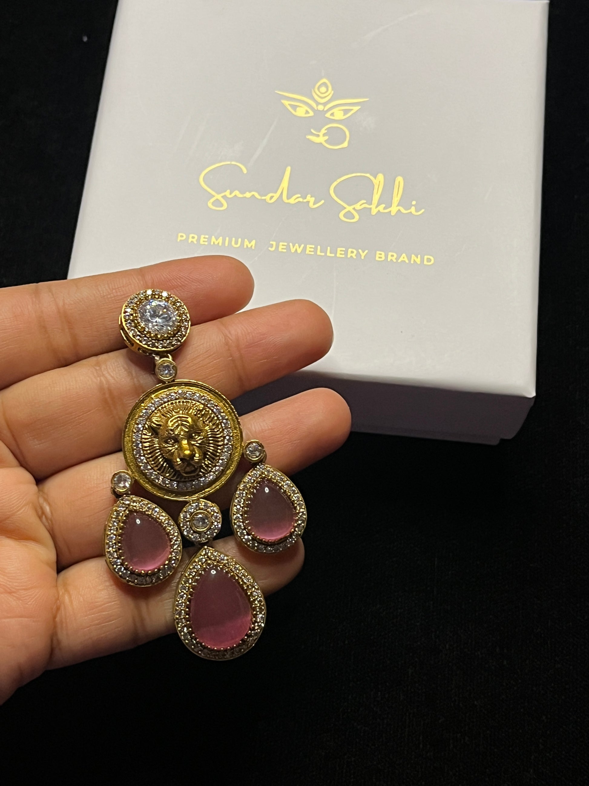 Dive into the realm of opulence with our SS Regal Roar Earrings, a manifestation of regal allure and majestic finesse. Crafted with meticulous attention to detail, these earrings feature a commanding lion motif atop, symbolizing strength and sovereignty. Below, three resplendent tear-shaped stones gracefully cascade, exuding an aura of timeless elegance. Adorn yourself with these exquisite earrings and unleash your inner royalty, as each sway and sparkle echoes the resounding roar of regality.