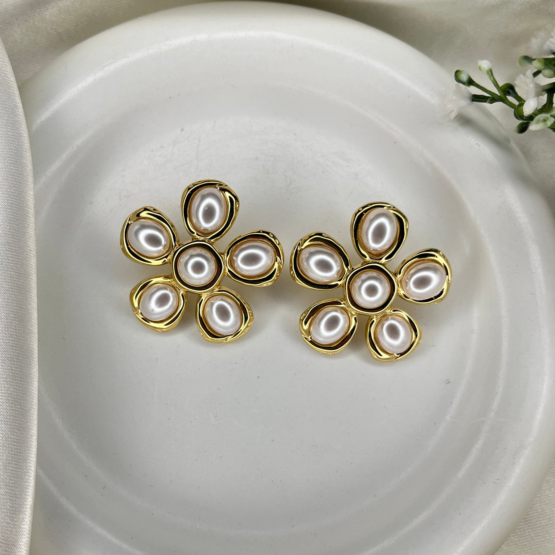 Delicate flower-shaped earrings adorned with lustrous pearls. A timeless accessory that blooms with elegance and grace.